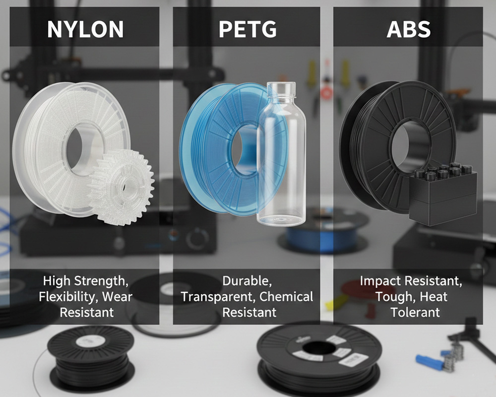 Choosing the right material means understanding not just strength and durability, but how each filament behaves during printing and over time. By matching your application’s requirements with the mechanical and environmental strengths of Nylon, PETG, or ABS, you’ll ensure successful, reliable 3D prints—whether for hobby projects, industrial prototypes, or end-use parts.